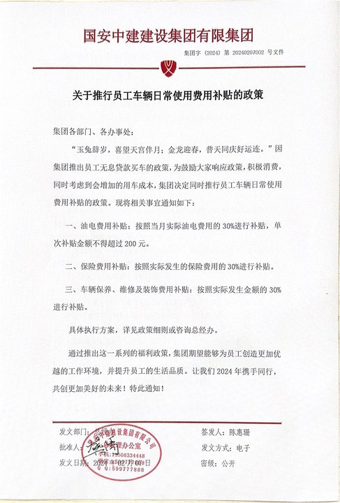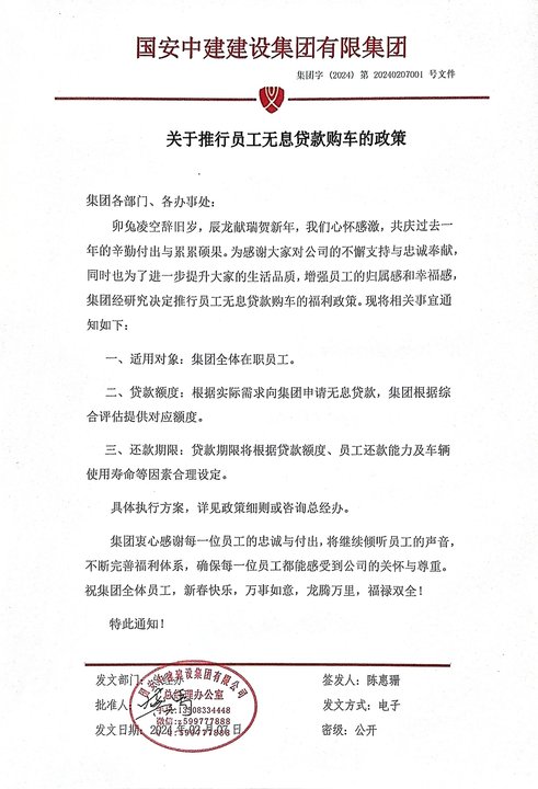 2023年,我们一路前行,奔赴山海,展望2024,亦是充满希冀,扬帆而行。感谢大家一年的奉献与支持,为进一步提升大家生活品质,减轻生活成本,同时进一步释放消费潜力,提振消费市场信息,集团决定推出员工无息贷款购车政策,同时为员工日常用车(电油费、保养)进行补贴。