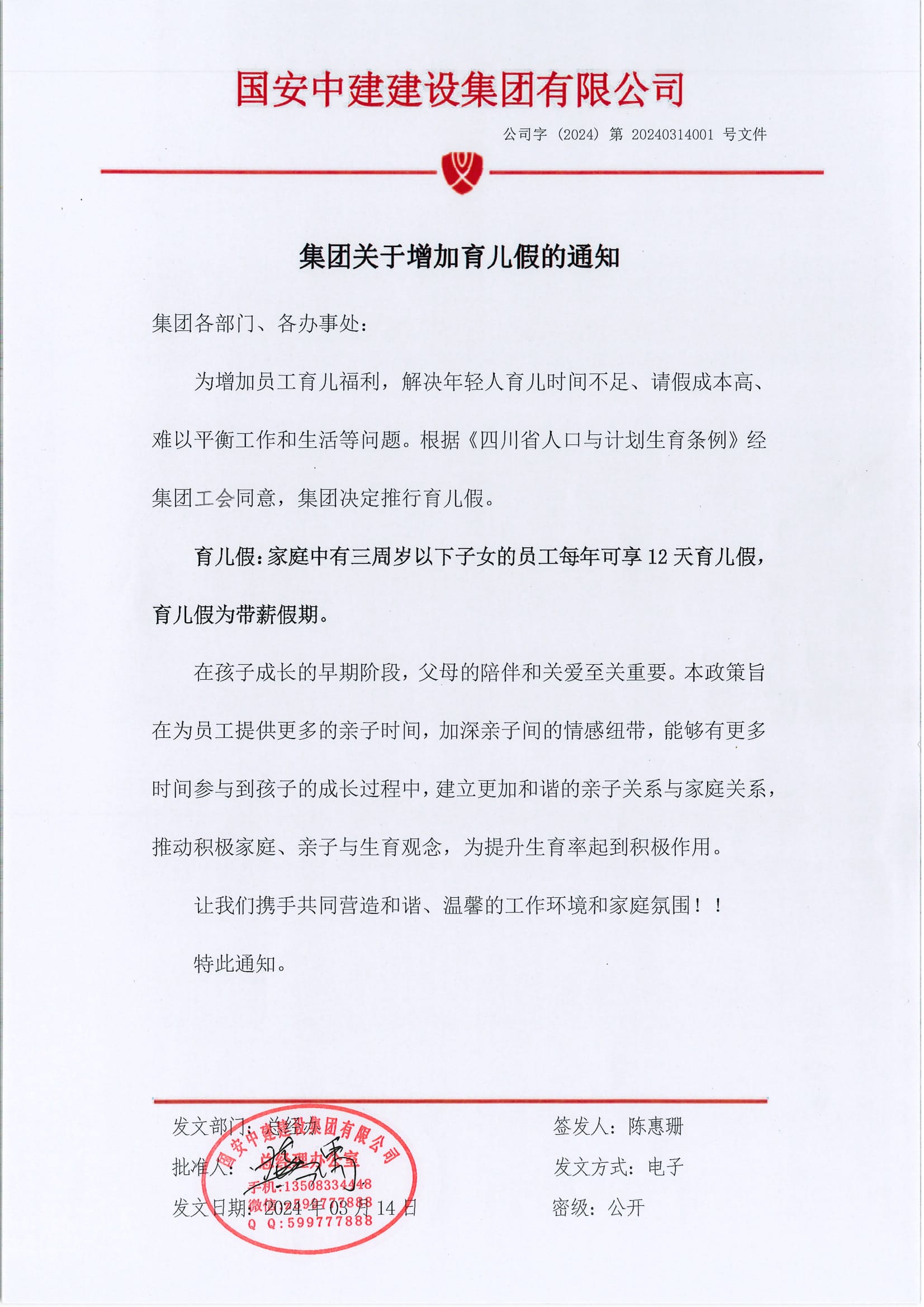 为落实党中央、国务院的重要部署,根据《四川省人口与计划生育条例》规定,经集团工会同意,集团决定:家庭中有三周岁以下子女的员工,每年可享有12天带薪育儿假。