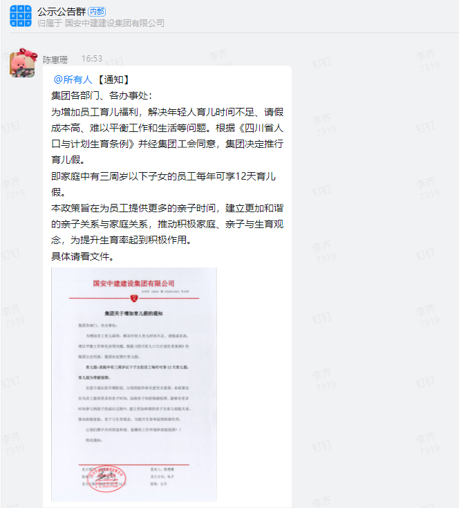 推行育儿假不仅是落实男女共同的育儿权利,也是促进平等就业的有效途径,有利于凸显家务劳动的社会价值。 在把工作做好做精的同时,我们希望能留出更多时间给员工自身,社会、企业、家庭,我们应该是一个良性、和谐的整体,这是共产主义不断努力的方向,也是一个企业的担当与使命。 希望这个政策实施后,我们的员工有更多时间参与进孩子的成长过程中,希望我们每个人在社会上有价值,在家庭中有担当。