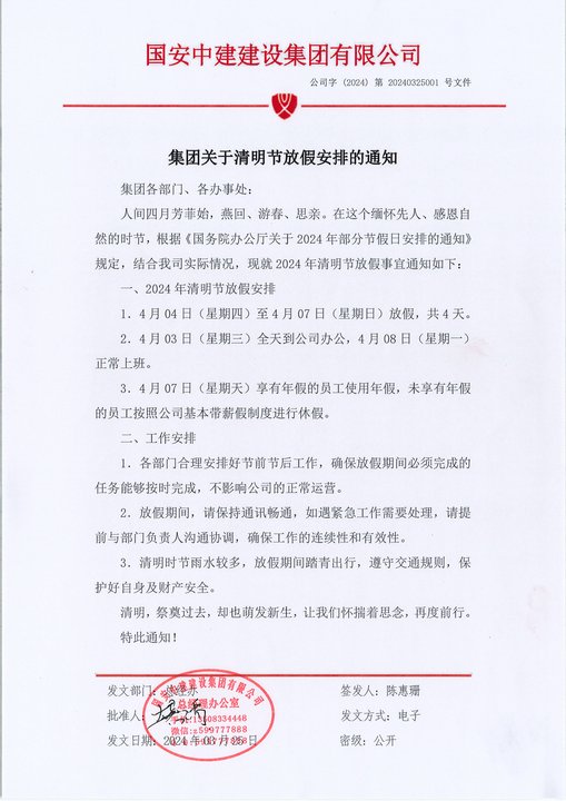 清明时节,物皆洁齐,大地呈现春和景明之象,正是行清墓祭与郊外踏青的好时节。根据《国务院办公厅关于2024年部分节假日安排的通知》,结合集团有关调休假的相关文件和实际情况,集团清明假期放假共4天,即2024年4月4日至2024年4月7日,4月8日正常上班。