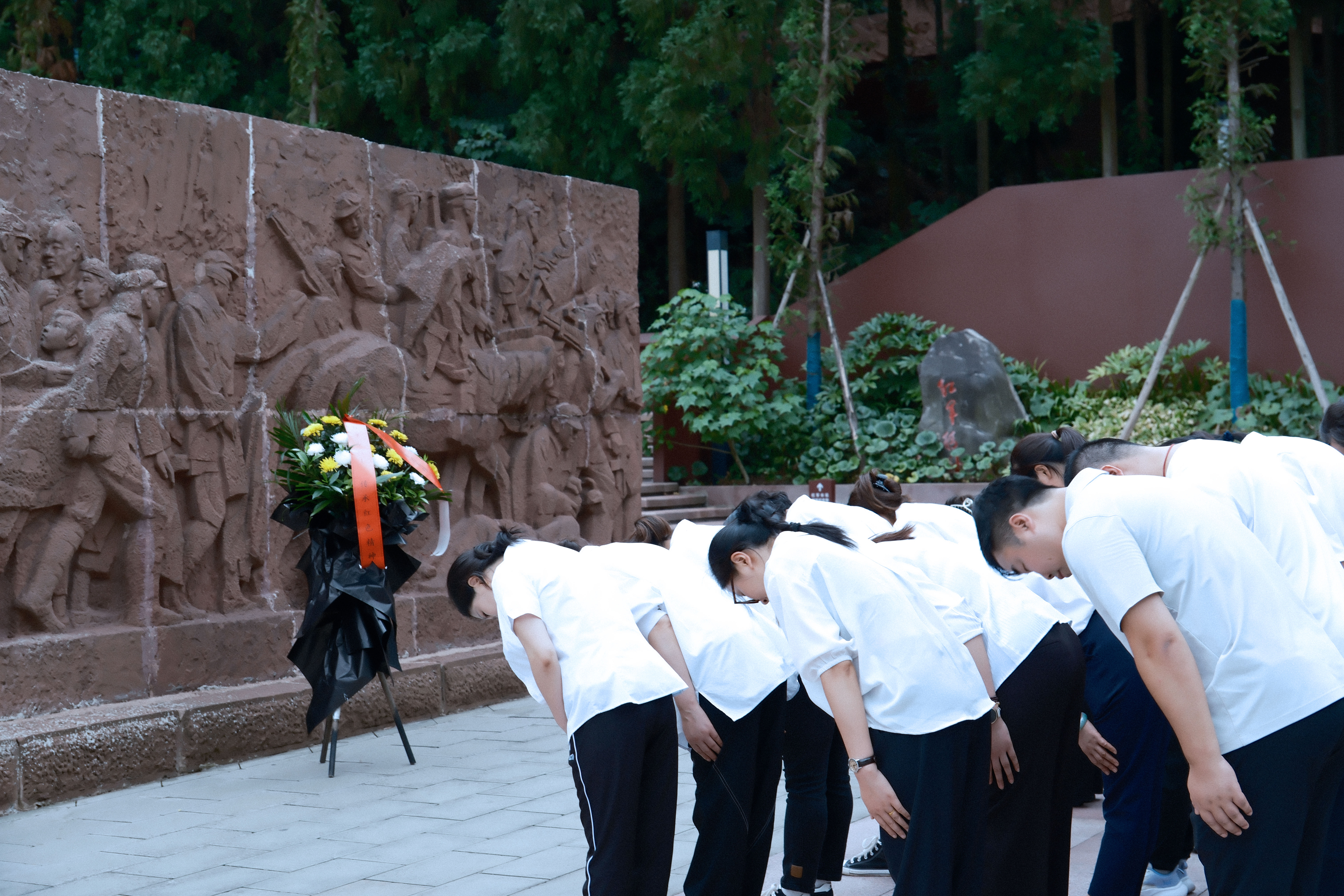从遵义会议遗址到朱德故里、建川博物馆、哈达铺......再到今年的邛崃红军长征纪念馆,为什么我们坚持党建活动就是要走进去? 学习长征精神不仅仅只是听听故事,写写感受。我们真实走过红军走过的路途,见到红军留下的器具,接触到红军留下的痕迹,如此真切感受到红军顾全大局、严守纪律、紧密团结的精神,体会为救国救民,不怕任何艰难险阻,不惜付出一切的崇高理想。 02走下去 接下去 传下去 一代人有一代人的长征。面对文物文献中呈现的血气方刚革命者为中华民族解放而战的身影,面对那些炽热的革命理想,革命宣传,革命动力,全体员工开始徒步走上红军路。重走红军路途仅仅6km,不及红军长征路万分之一二,面对陡峭的山路以及突如其来的暴雨,无人退缩,坚持走完全程。 如果我们不说,还有谁去说?如果我们不记得,还有谁去记得?追寻革命足迹也就是在追寻我们的来处,探索我们的归处。 站在广场的红军石刻浮雕墙下,以最崇高的敬意献上花篮,党员们高声背诵入党誓词,凭吊瞻仰过程中,每个人都会有所收获,这种收获会通过行动与话语传递,一代代。 “长征是宣言书,长征是宣传队,长征是播种机。长征是以我们胜利、敌人失败的结果而告结束。” 此去花团锦绣,山河太平,俱以热血与信念浇筑,接下时代的一棒,我们每个人都昂首走在新的长征路上。